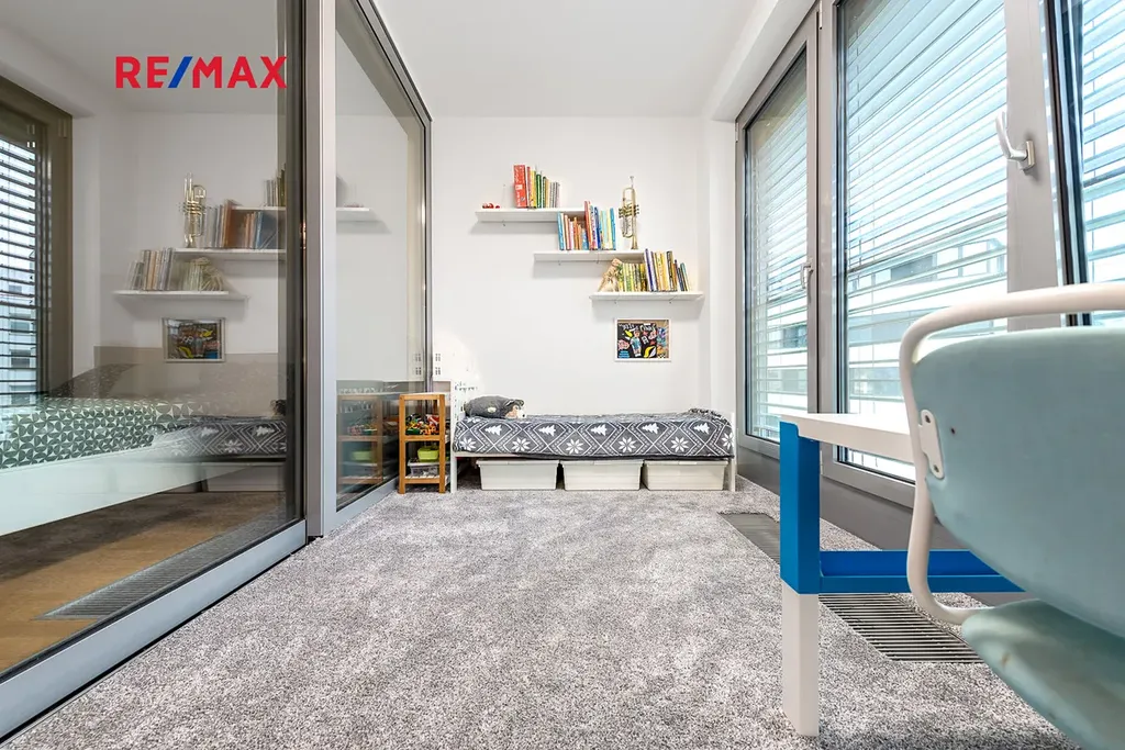 Moderní francouzská okna s hliníkovými rámy a izolačními dvojskly splňují současné stavební normy a zajišťují výbornou tepelnou i zvukovou izolaci. Venkovní elektricky ovládané žaluzie umožňují plynulé nastavení míry zatemnění (0–100 %). V bytě jsou kvalitní laminátové podlahy v dubovém dekoru. Vytápění je řešeno vestavěnými konvektory s individuálním ovládáním pomocí termostatů Siemens v každé místnosti, včetně dětského pokoje. V bytě je čerstvě instalována klimatizace (není na fotografiích).