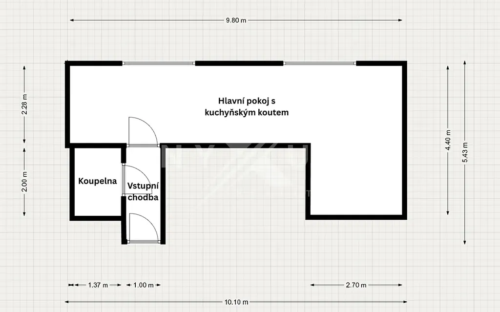 Byt je tvořen vstupní chodbou, koupelnou se sprchovým koutem a hlavním pokojem s kuchyňským koutem.