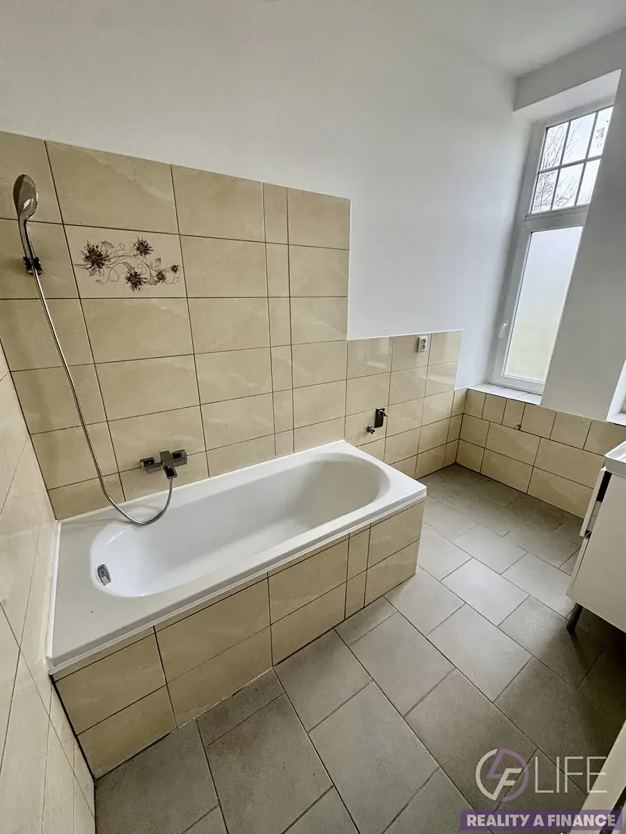Dispozice bytu: kuchyň s novou kuchyňskou linkou, koupelna s vanou, samostatné WC, obývací pokoj a ložnice.
