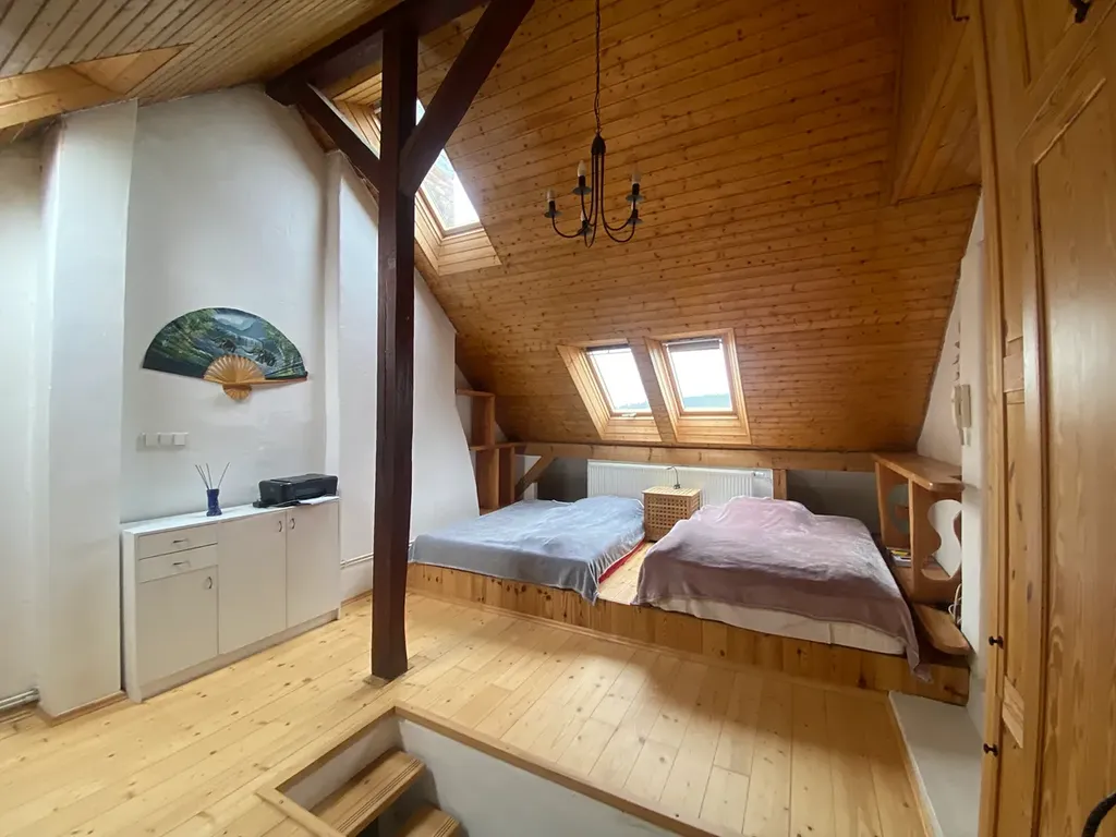 ve 2. podlaží bytu (4. podlaží v domě v podkroví), se nachází prostorná ložnice, obložená dřevem s velkorysým úložným prostorem, vysokými stropy a 3 střešními okny. Nástavba domu, kde se byt nachází je viditelně nově provedena v nedávné době. Byt je vybaven samostatným kombinovaným plynovým kotlem, který zajišťuje dodávku tepla a teplé vody.