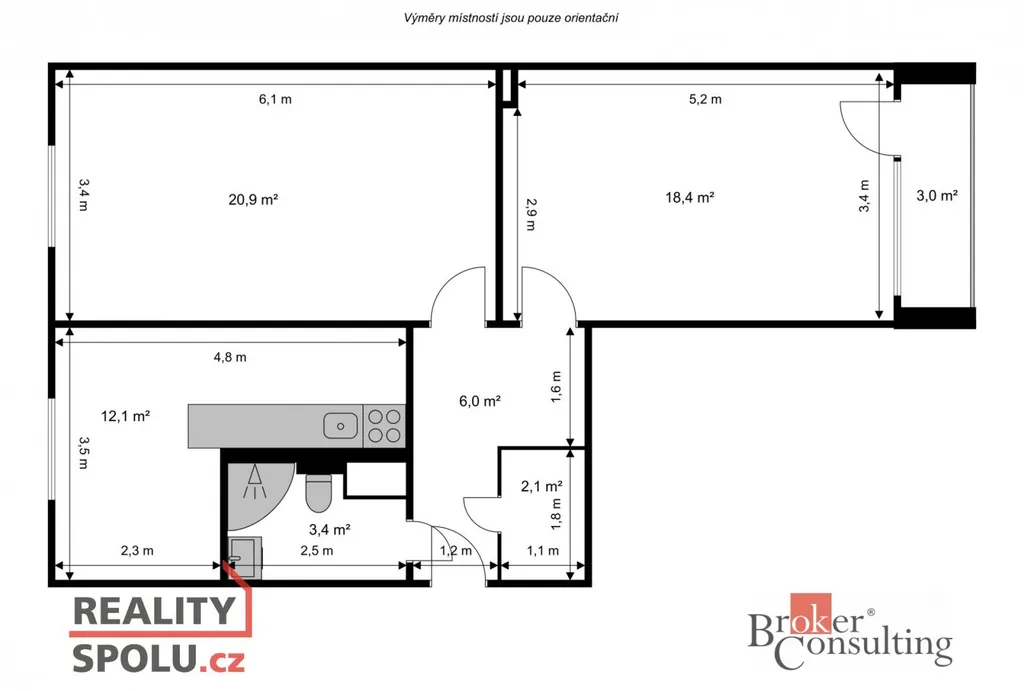 Součástí je balkón (3 m²), sklep (2 m²) a zajištěné parkování. Internet v domě k dispozici.