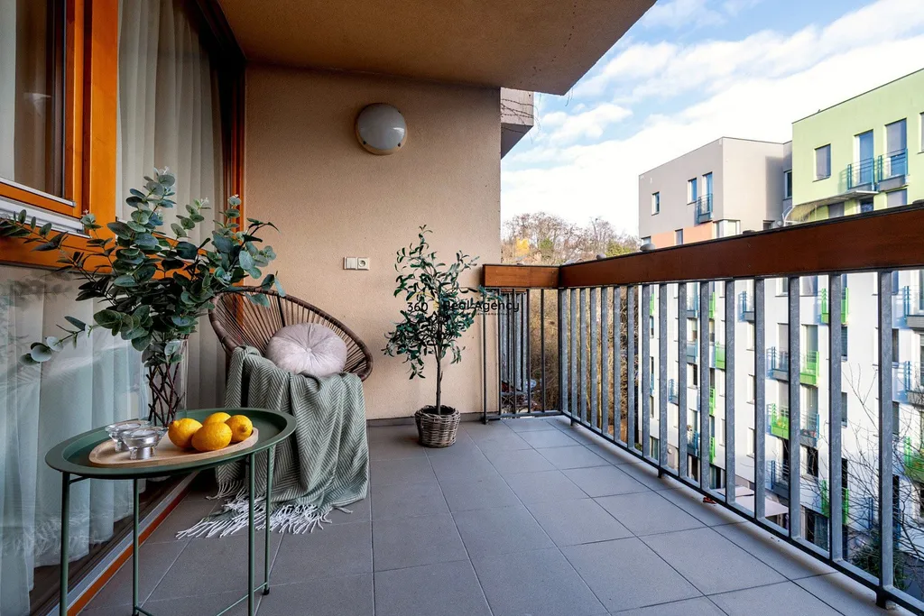 K bytu náleží dvě terasy – větší terasa o velikosti 12,1 m² se vstupem z obývacího pokoje je orientovaná na jihozápad a nabízí příjemné posezení i dostatek prostoru pro relaxaci. Druhá terasa má 6,2 m². Součástí prodeje je také parkovací stání.