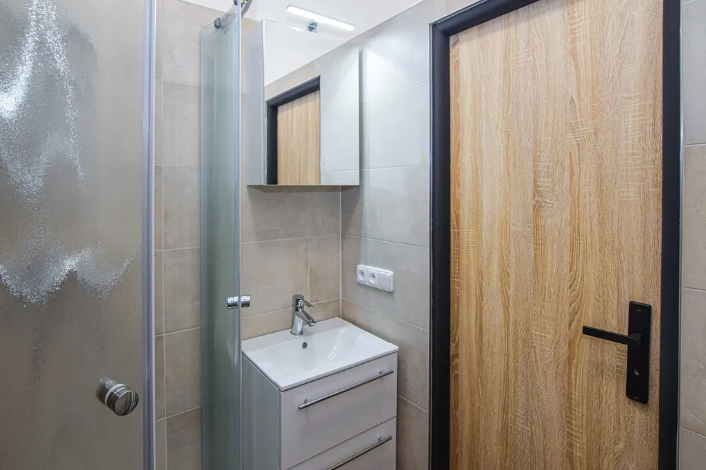 Na podlaze je položena dlažba v kombinaci s plovoucí podlahou. Interiérové dveře jsou v dekoru dřeva.