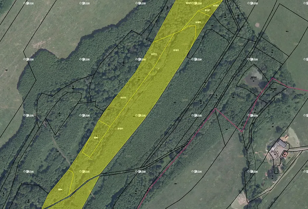 Pozemky patří pod LV: 661 a 697 (o podílu 1/6), parcelní číslo: 600/9, 600/10, 603/1, 605, 609, 613/1, 616/1, 617/1, 618/1, 624/1, 630/2, 631/2.
