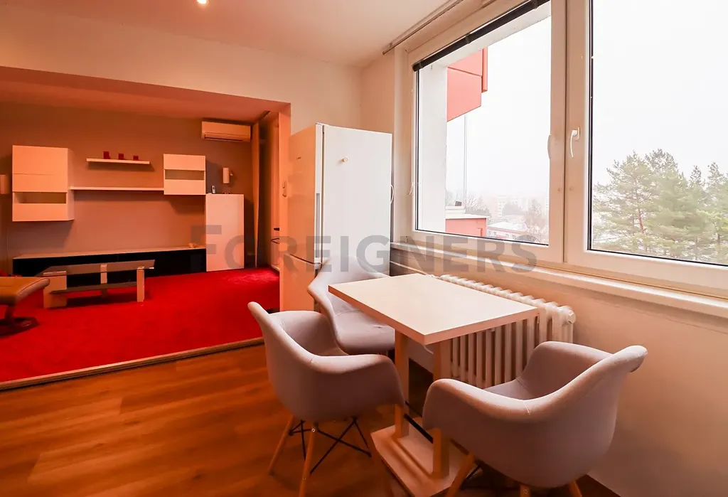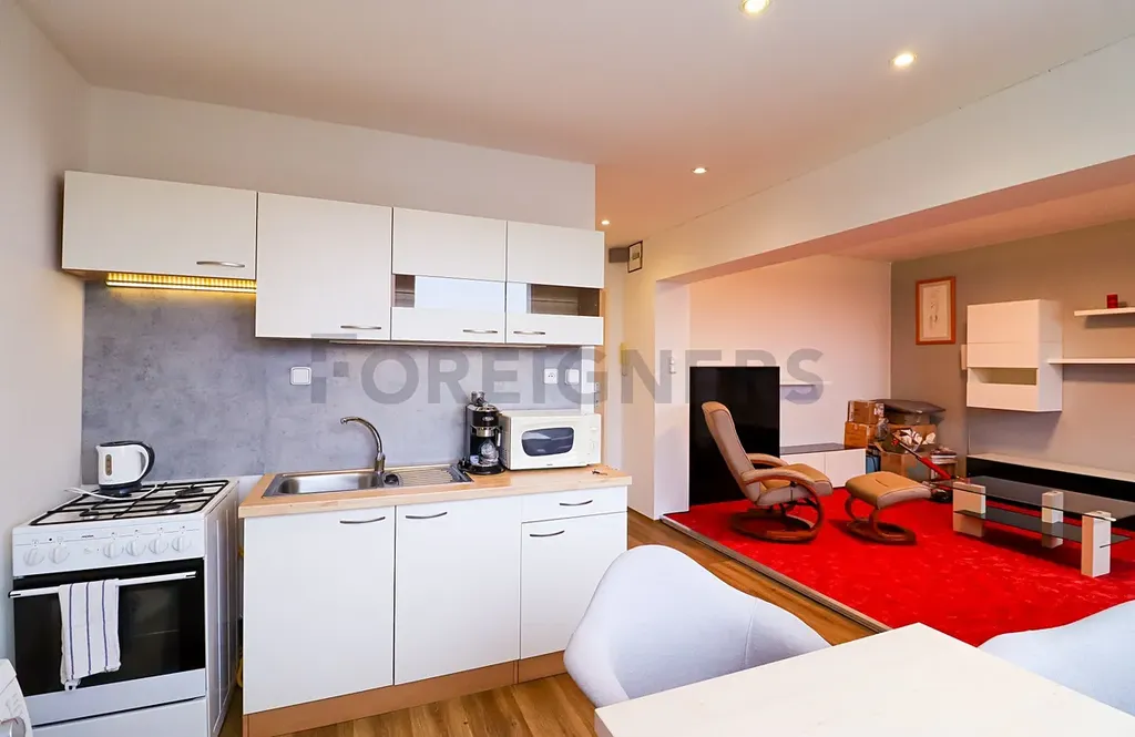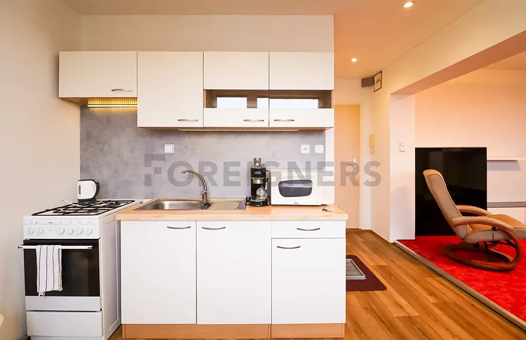 Byt je částečně vybavený – k dispozici je kuchyňská linka se sporákem, lednička, pračka, obývací stěna a nová koupelna. Dispozice je praktická a byt působí velmi příjemně a vzdušně.