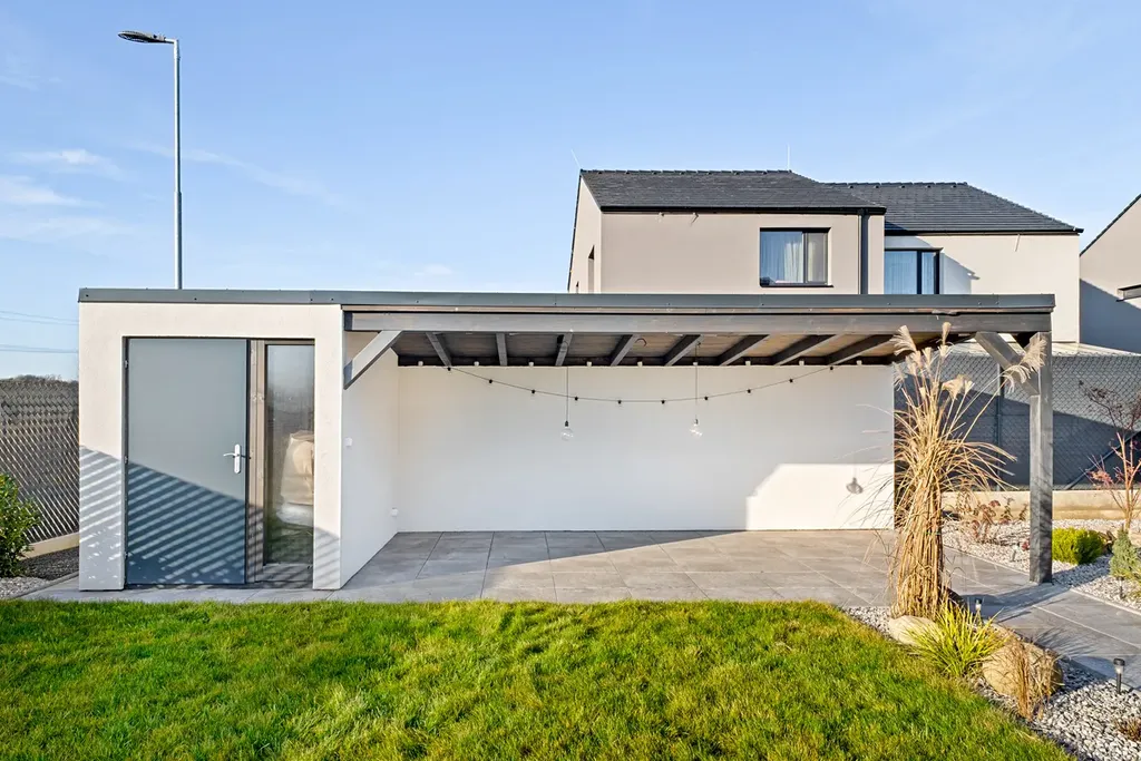 Zahradní posezení je zasazeno tak, aby splňovalo absolutní soukromí a navazuje na zděný zahradní sklad.