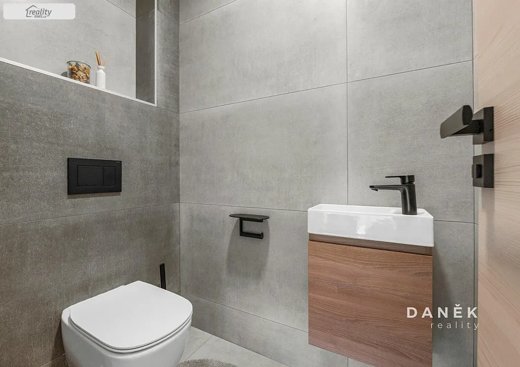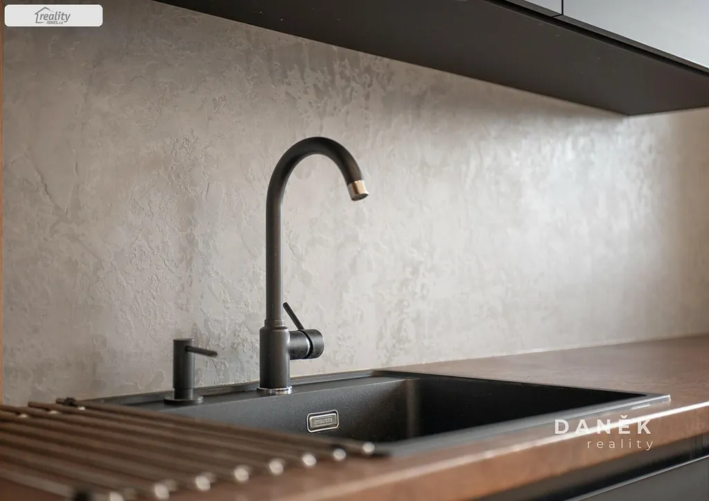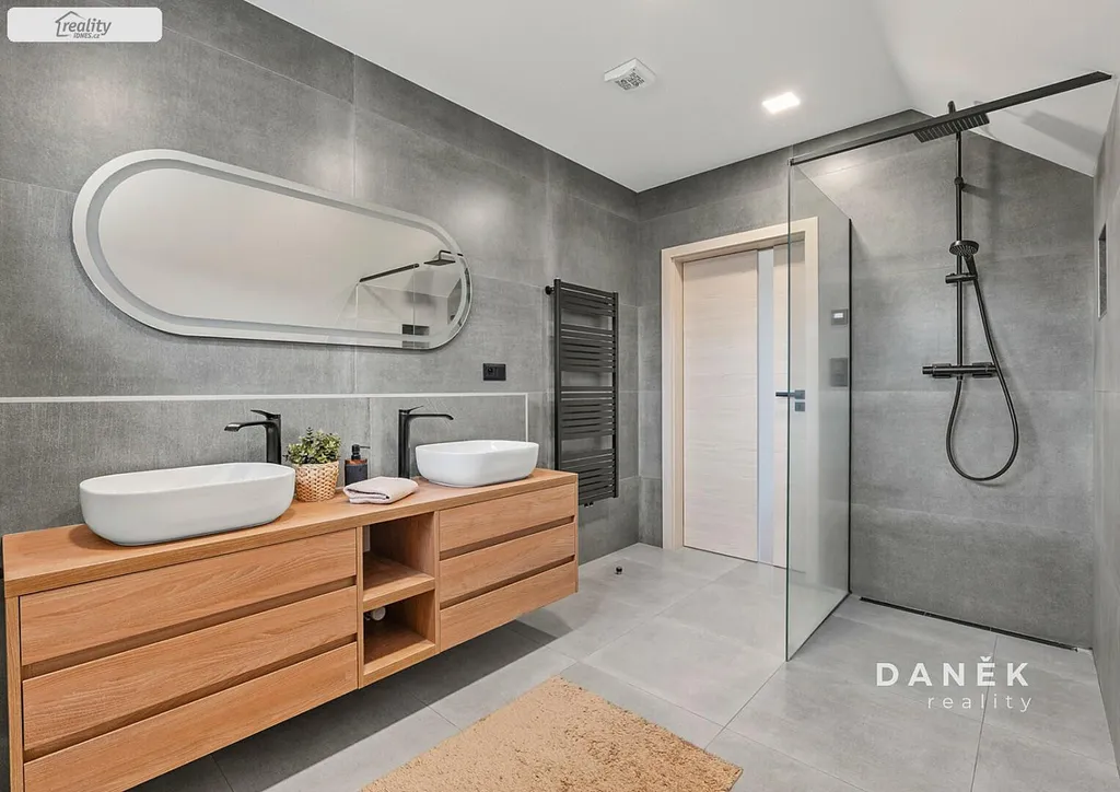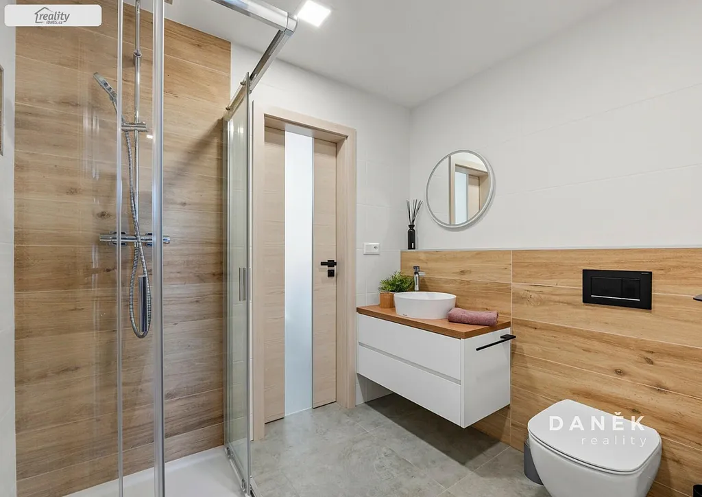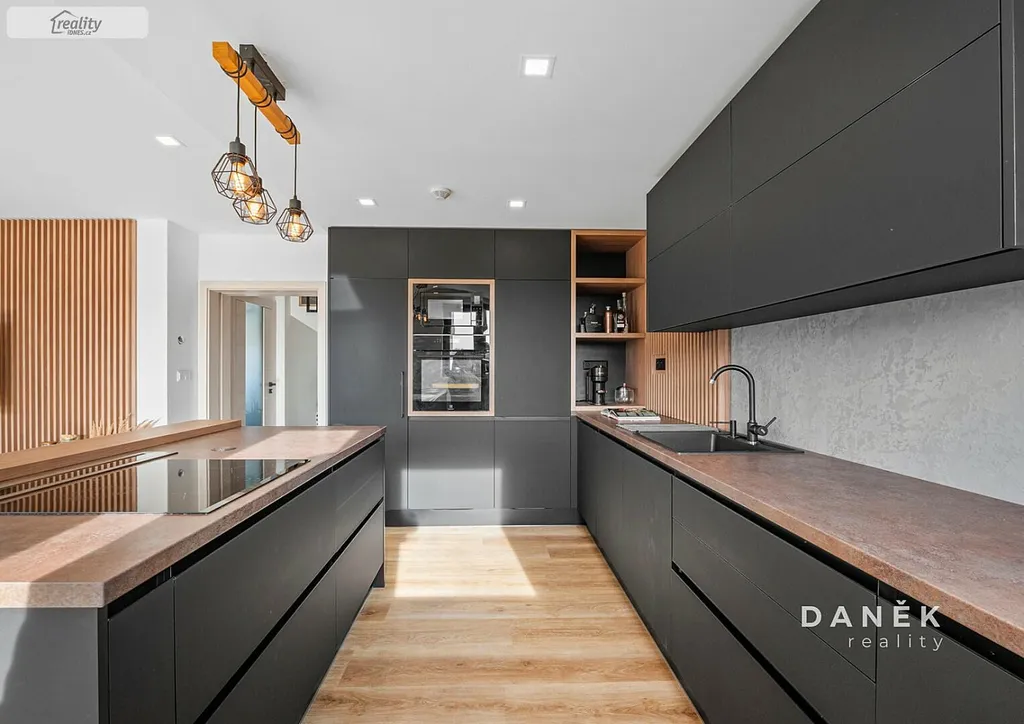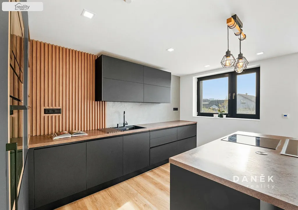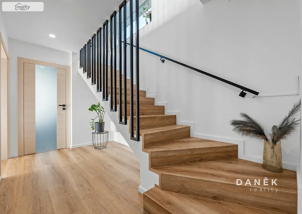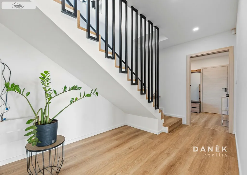 Interiér byl navržen s důrazem na detail, kvalitu a funkčnost – nabízí vyšší standard, než bývá běžně. Vinylové podlahy v celém domě. Designová kuchyně na míru, která je plně vybavená spotřebiči. Vestavěný nábytek, dýhované dveře Sapeli a kvalitní obklady. HS portál v antracitu – propojuje obývací prostor s terasou. Dvě koupelny – jedna s vanou, druhá se sprchovým koutem. Vinylový obklad schodiště, betonová stěrka a precizní řemeslné detaily. V domě se snoubí elegance, praktičnost a teplo domova – každý detail byl promyšlen.