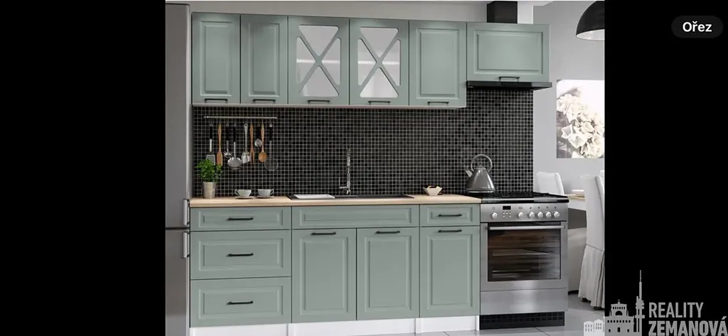 obývací pokoj s kuchyňským koutem 19,3 m2 (bude dodána zelená linka, černé spotřebiče: myčka, lednice s mrazákem, trouba, mikrovlnka, digestoř)