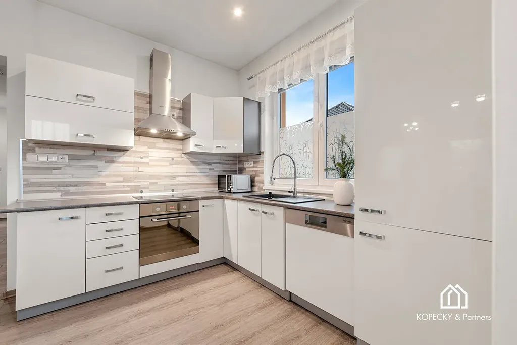Interiér působí čistě, funkčně a je ve velmi dobrém stavu. Obývací pokoj je propojený s kuchyní a nabízí přímý vstup na terasu, což vytváří plynulý přechod mezi interiérem a zahradou. Dům disponuje ložnicí, dětským pokojem, koupelnou s vanou i sprchovým koutem a samostatným WC. K dispozici je také zateplená půda o výměře 12 m² vhodná jako úložný prostor.