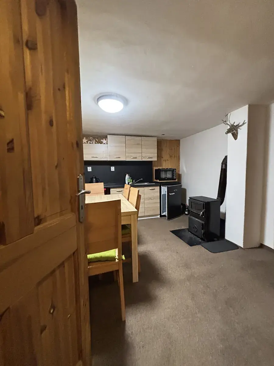 Kuchyň s kuchyňskou linkou, jídelním stolem, krbovými kamny a navazující obývací pokoj.
