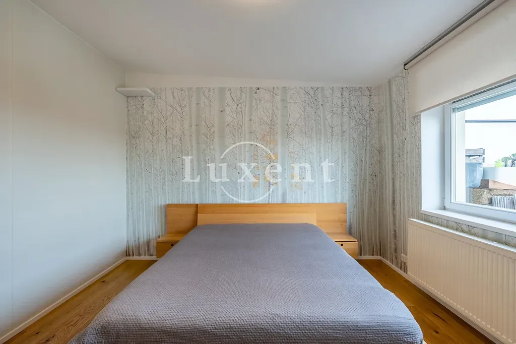 Dominantou bytu je světlý obývací pokoj s plně vybavenou kuchyní (všechny spotřebiče včetně myčky, indukční varné desky, trouby, lednice a mrazáku). Součástí dispozice je hlavní ložnice s vlastní walk-in šatnou, dále dětský pokoj a samostatná pracovna. Koupelna je vybavena dvojumyvadlem a vanou, toaleta je oddělená a navíc osazená bidetem.