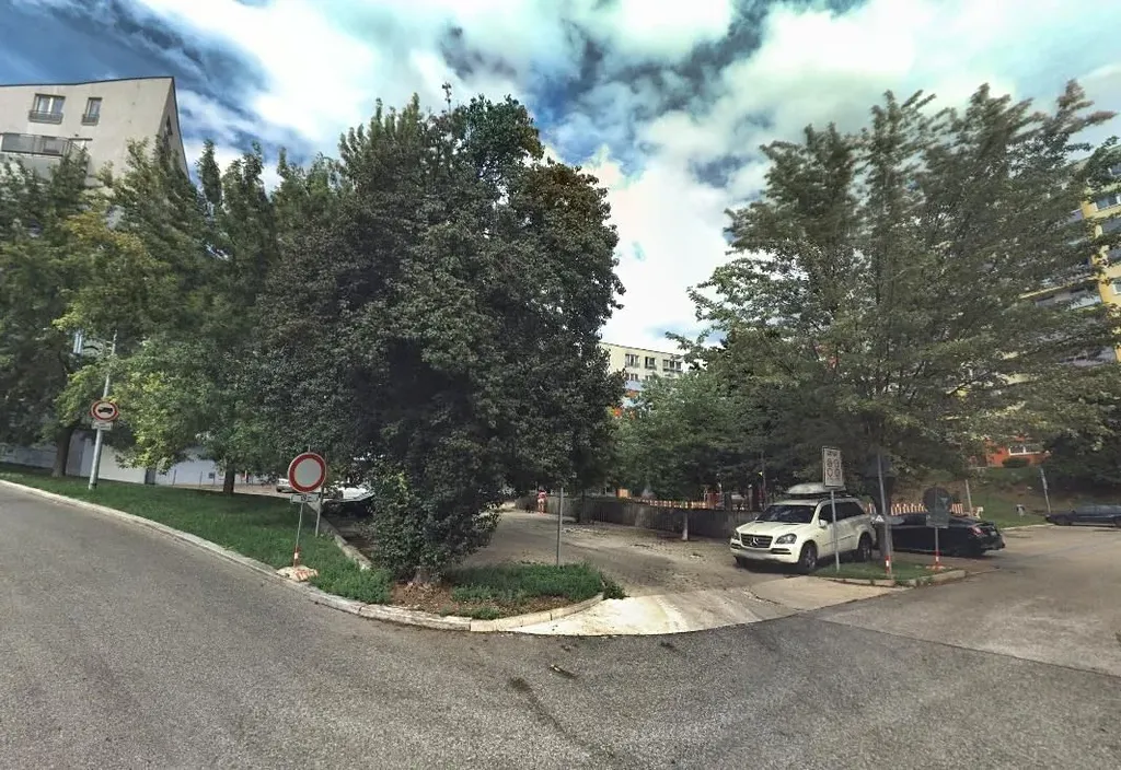 Parkovací stání (venkovní, nezastřešené) na soukromém pozemku před činžovním domem Kudrnova 4, Praha 5, Motol. Jedná se o konkrétní, vyhrazené stání.