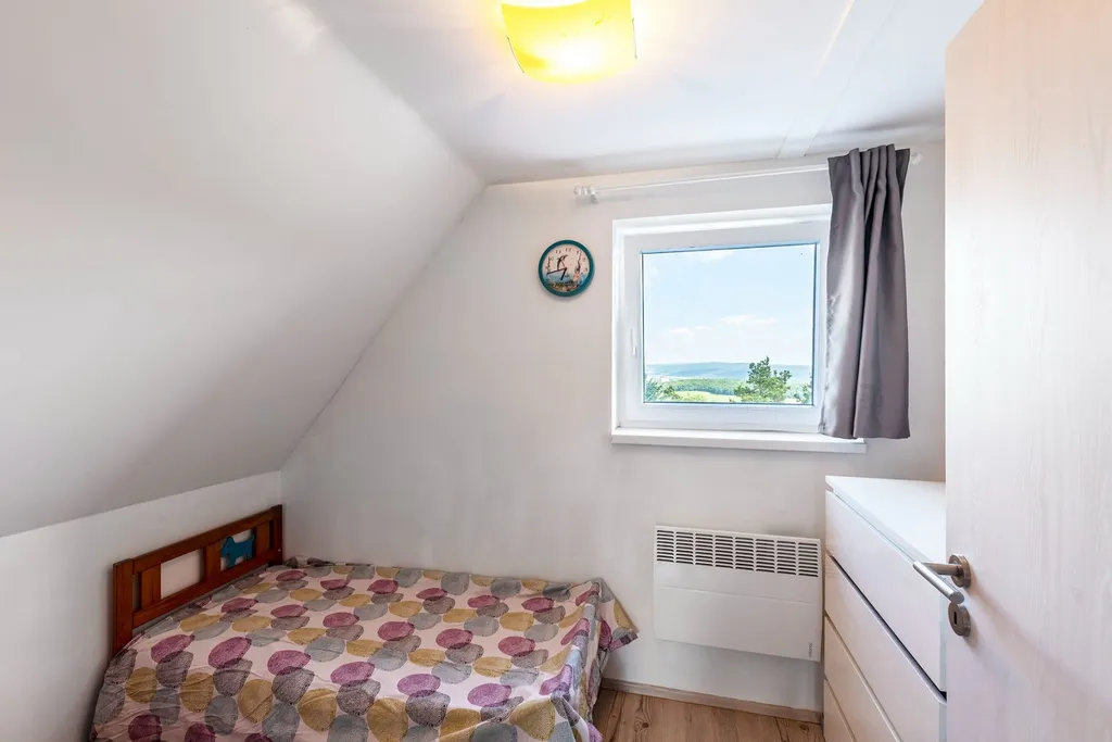 Dovolte mi Vám představit výjimečné místo plné klidu, s výhledy do přírody a vynikajícím dosahem občanské vybavenosti. Rodinný dům 4+KK po celkové rekonstrukci se nachází v rekreačně obydlené části Brna – Žebětín. Disponuje vlastní vrtanou studnou s pitnou vodou, parkováním na vlastním pozemku pro 3 auta a dostatečně prostorným pozemkem. Dispozice rodinného domu na vlastním pozemku s příjezdovou komunikací sestává ze tří pater – podzemní podlaží (35,4 m2), přízemí (35,1 m2), podkroví (20 m2), to celé o celkové užitné ploše 90 m2. V podzemním podlaží se nachází nyní úložné prostory s potenciálem vybudování 1+KK s koupelnou a WC. Přízemí: zádveří, kuchyně na míru se spotřebiči, obývací prostor s krbovými kamny doplňuje jídelní kout (12,3 m2). Dále koupelna s vanou (2,7 m2) a samostatné WC (1,73 m2), dětský pokoj (10,75 m2) s krásným výhledem do okolí Bystrce, technická místnost pod schodištěm. Podkroví: ložnice (13,2 m2) s orientací JZ a velkými okny vybízející ke vstupu na terasu (12,5 m2), kterou je možné zde vybudovat, dále dětský pokoj či pracovna (6,7 m2). Nespornou výhodou jsou velmi nízké náklady díky nízkému tarifu, vlastní vrtané studni hluboké 140 m s pitnou vodou v kombinaci s vytápěním elektrickými přímotopy. Odpady jsou řešeny řádně zkolaudovanou ČOV. Potenciál je ve vybudování solárních panelů s kotlem k dosažení ještě nižších nákladů, dále zřízení trvalého bydliště v objektu také není problém. V okolí žijí také rodiny s dětmi, které využívají objekty k trvalému bydlení nebo rekreaci a pokud zároveň preferujete klid, jste na vyvýšeném místě, které tento požadavek splňuje. Členěná zahrada je rozdělena na prostor pro parkování s příjezdem po obecní komunikaci, místo pro děti s klidovou částí se zapuštěným bazénem posezením u ohně s množstvím ovocných stromů a část kaskádovitou pro vybudování okrasných záhonů. Občanská vybavenost okolí: MHD 5 min., vše v blízkém centru Žebětína, cyklostezky vedoucí do okolí obory Holedná, blízkost chráněného území Žebětínského rybníka, Brněnské přehrady, Vrboveckého Mlýna, Žebětínského dvoru, restaurací, sportovišť, ZUŠ, MŠ, ZŠ a mnoho dalšího.