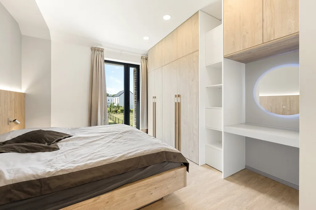 V patře najdete tři ložnice – hlavní ložnice má vlastní koupelnu se sprchovým koutem a toaletou a prostornou šatnu, dva dětské pokoje jsou vybaveny chytrými vestavnými patry, která šetří místo a přinášejí další hrací i úložný prostor. K dispozici je zde také druhá koupelna s vanou a samostatné WC.