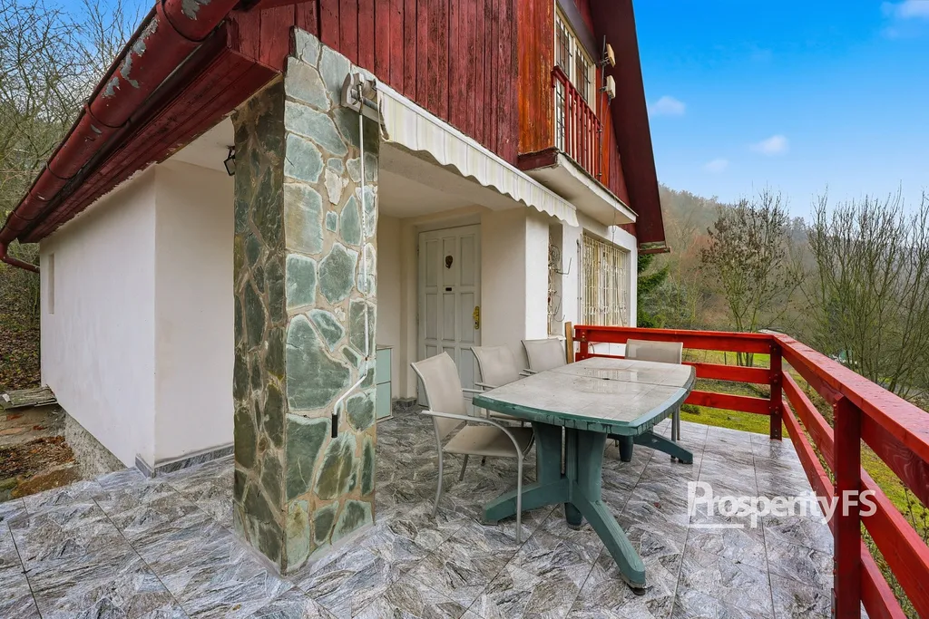 Vybavení chaty zahrnuje částečně zařízený interiér, který oceníte při relaxaci u krbu nebo na terase o velikosti 15 m² s jedinečnými výhledy na okolní krajinu. K dispozici je také sklep o velikosti 5 m² pro vaše úložné potřeby. Venkovní bazén s technologií, zahradní domek a ovocné stromy dodají vašemu venkovskému útočišti dokonalou atmosféru.