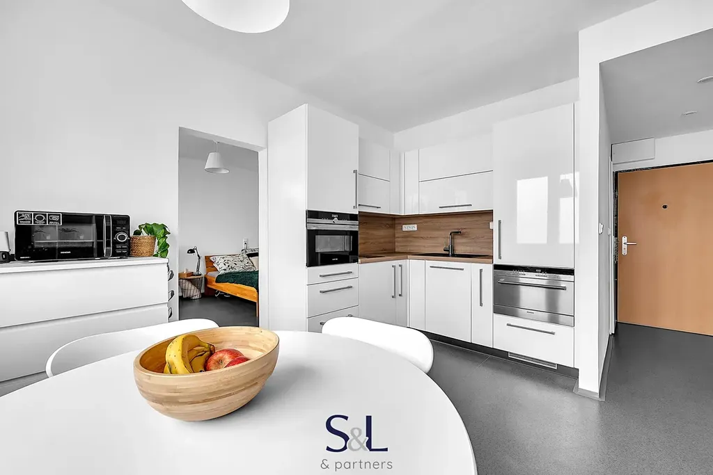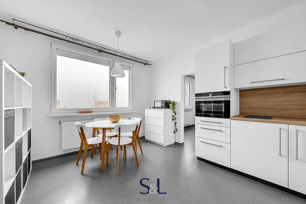 Byt je vybaven novou rohovou kuchyňskou linkou včetně vestavěných spotřebičů (elektrická trouba, myčka, lednice, indukční varná deska). Samozřejmostí jsou plastová okna s dvojskly a k bytu náleží také sklepní kóje.