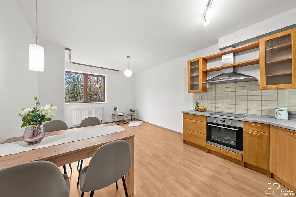 Prostorný a udržovaný byt 2+kk, 59 m2 s balkonem 5,25 m2 a komorou umístěnou v bytě 4,5 m2 v bytovém domě v Bohnicích, ulice Ústavní č.p. 413. Venkovní parkovací stání na oploceném pozemku bytového domu. Příjezd skrze el. ovládanou bránu. Další možnost parkování v ulici.