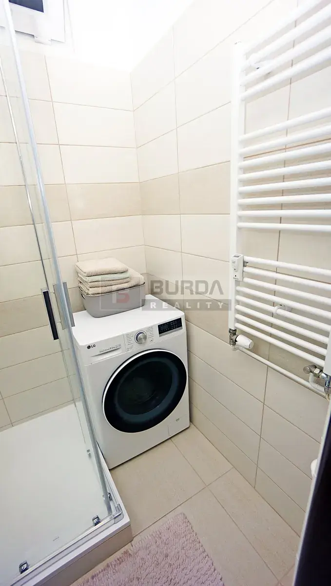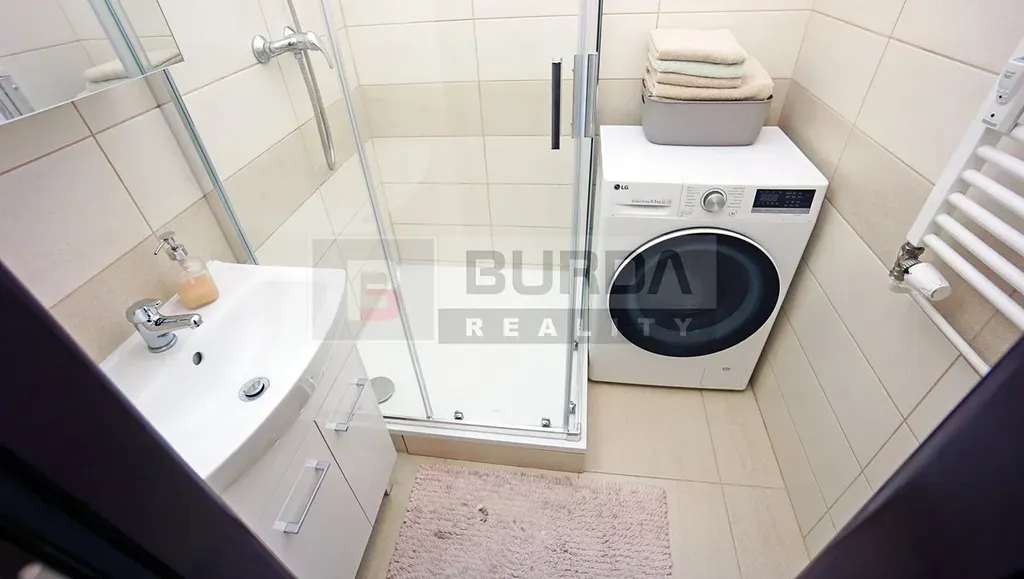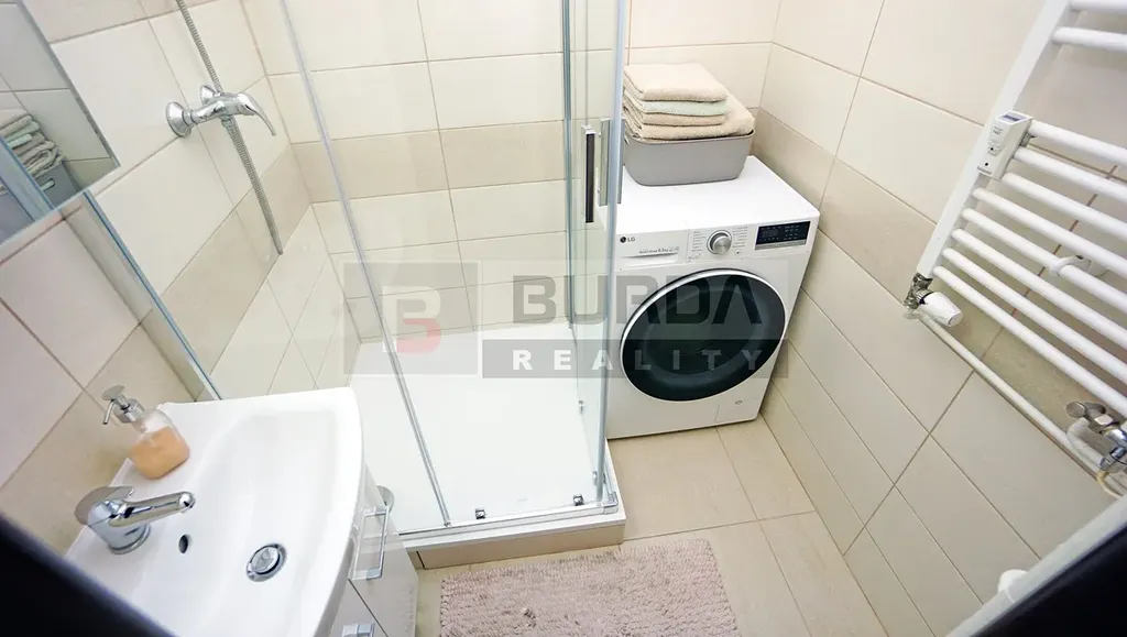 V bytě byla před rokem kompletně zrekonstruována koupelna, která je vybavena sprchovým koutem, umyvadlem se skříňkou, skříňkou se zrcadlem a LED bodovkou, topným žebříkem a přípojkami pro pračku. Pračka LG nezůstane.