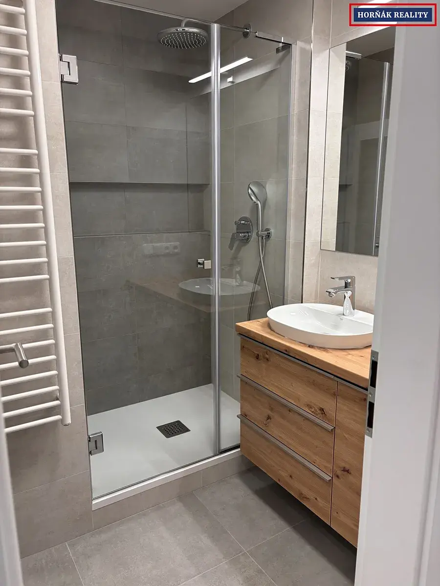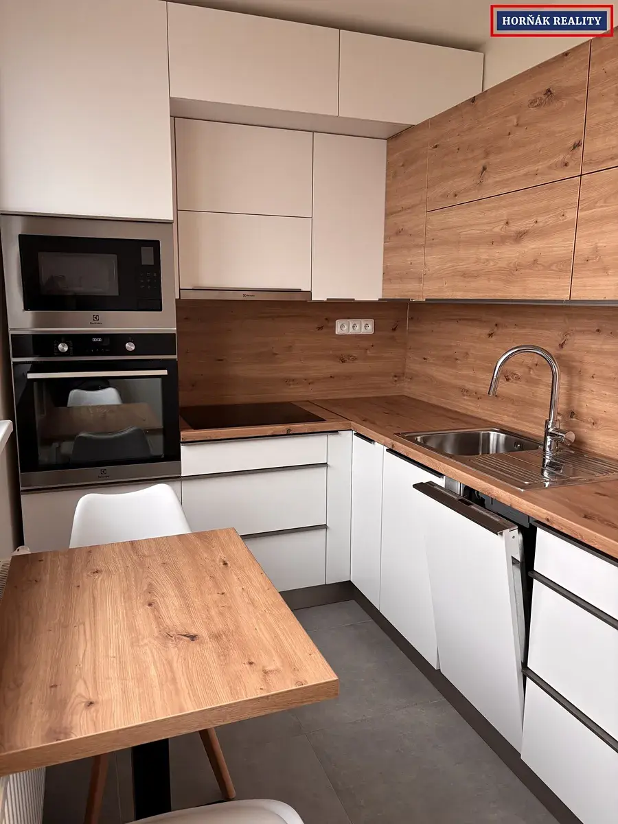 Samotný byt prošel nedávno kompletní rekonstrukcí. Je velmi vkusně a moderně vybaven. Celý byt má novou elektroinstalaci, zděné jádro, podlahy, radiátory, venkovní a vnitřní žaluzie a sádrové omítky. Vstup do bytu zajišťují bezpečnostní dveře. Kuchyň je osazena vestavěnými spotřebiči - sklokeramická deska, trouba, myčka, mikrovlnná trouba a digestoř. Součástí je jídelní stůl se dvěma židlemi. Koupelna je společná s WC a sprchovým koutem. V obytném pokoji je klimatizace, kterou oceníte zejména v teplých letních dnech, šatní skříň a malá obývací stěna s televizí. Byt má přípojku na internet optikou. K užívání je připravena i sklepní kóje.