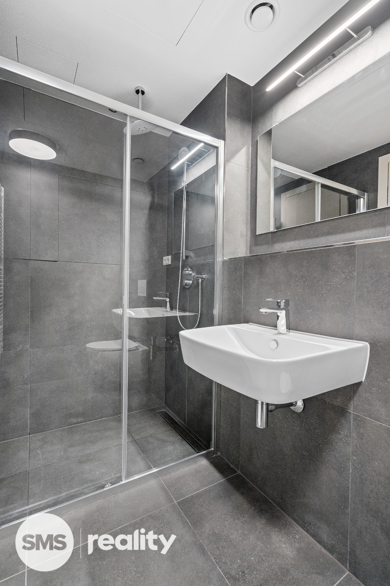 V předsíni se nachází velká vestavěná skříň, koupelna je elegantní a moderní, vybavená sprchovým koutem a toaletou.