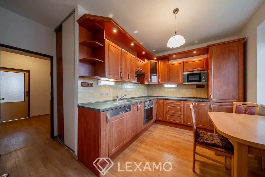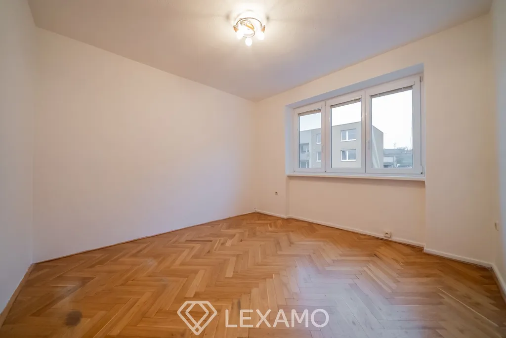 Jednotka je umístěna ve 2. nadzemním podlaží cihlového bytového domu a nabízí celkovou plochu 92 m², včetně balkonu a tří sklepů. Dispozičně je velmi dobře řešena – dvě ložnice, obývací pokoj se vstupem na balkon o velikosti 2 m², samostatná kuchyně, koupelna, toaleta a prostorná vstupní chodba. V obytných místnostech jsou parkety, okna jsou plastová.
