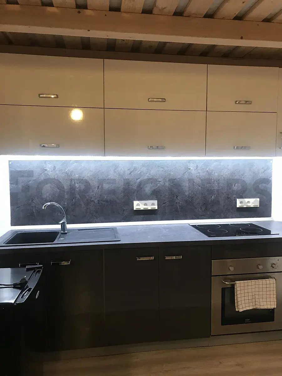 Prostor je vybaven praktickou patrovou postelí, která vytváří více prostoru pro bydlení a relaxaci. Plně vybavená kuchyň zahrnuje vestavěnou indukční varnou desku a elektrickou troubu. Pohodlná pohovka dotváří příjemnou atmosféru.