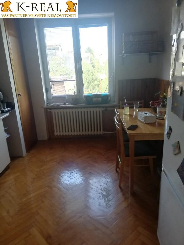 Jedná se o řadový rodinný dům, v jehož celém jednom patře se nachází předmětný byt. Patro první. Přístup chodbou po schodech do patra. Byt je pěkný, v dobrém stavu, prostorný a slunný. S velkou halou, samostatnými vstupy do pokojů. Má samostatnou kuchyň. Koupelna s vanou. WC zvlášť. Celková plocha bytu 100 m². Byt je zařízený a vybavený částečně. V kuchyni kuchyňská linka a sporák. Byt má parkety a plastová okna. K bytu patří zasklená dvojlodžie. Dům je v dobrém stavu, cihlový a má supr izolaci. Byt je volný 1.1.2026.