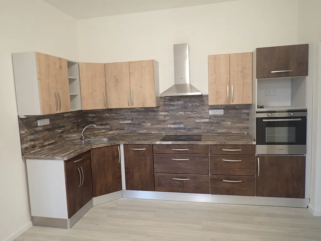 Bytová jednotka má kuchyňskou linku se sklokeramickou deskou, vestavnou troubou, digestoří a malou myčkou.