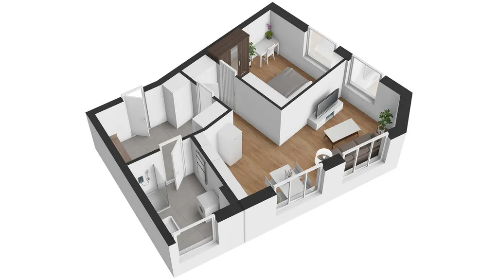 • Ložnici o velikosti 10,5 m², která bude přepažena z původního obytného prostoru o celkové výměře 34,74 m²; vstup do ložnice je řešen praktickými shrnovacími dveřmi, což umožňuje flexibilní využití prostoru.