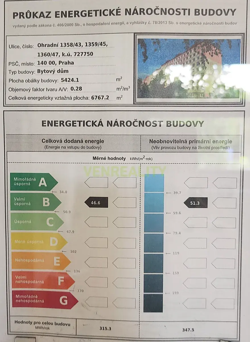 Bytová jednotka se nachází v posledním, 9. nadzemním podlaží revitalizovaného panelového bytového domu (energetická náročnost budovy „B“ velmi úsporná). K bytu náleží rovněž sklep pod vlastním uzamčením.