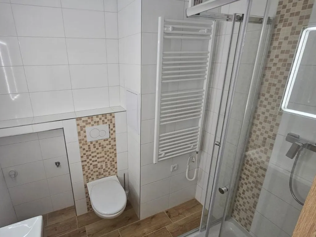 Interiér bytu je světlý a útulný. Na chodbě a v pokoji najdete hezké a prostorné vestavěné skříně. Obývací pokoj je propojený s kuchyní a působí svěžím dojmem. Kuchyňská linka je v perfektním stavu a má dostatek prostoru na uložení všech potřebných věcí. Kuchyně je vybavena troubou, mikrovlnkou a digestoří. V hezky situované koupelně najdete sprchový kout a prostor na pračku.