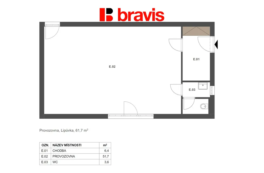 Ve výhradním zastoupení developera nabízíme k prodeji jednotku komerčního prostoru (označeného jako jednotku 1E) o užitné ploše 61,7 m² v obci Lipůvka u Brna. Prostor, nacházející se v prvním nadzemním podlaží, nabízí hlavní místnost o vel. 51,7m2, chodbu a koupelnu s oddělenou toaletou.