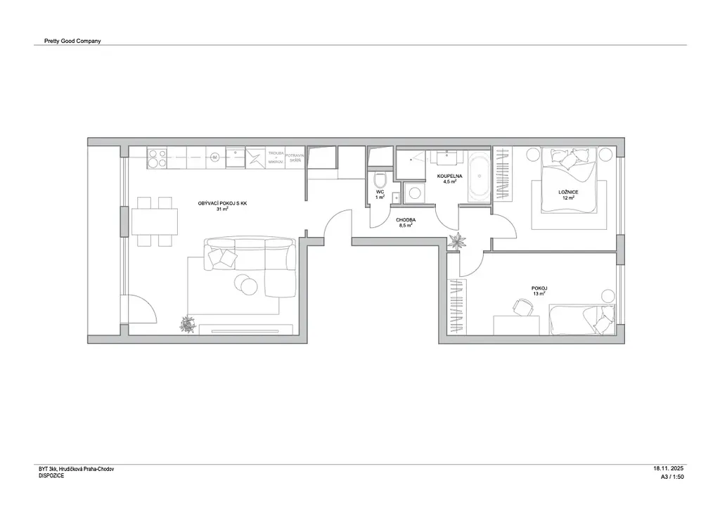 - Obývací pokoj s prostornou kuchyní na míru (31 m2)
