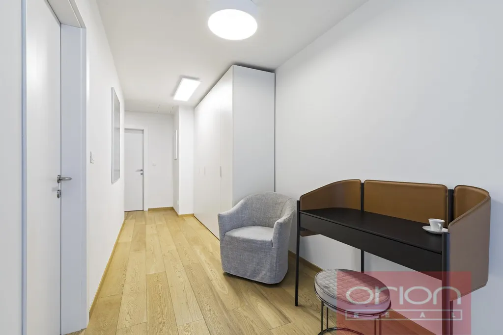 Nabízíme k pronájmu luxusní byt 2+kk s terasou v 1. patře novostavby Rezidence Ellipsis s recepcí, výtahem, podzemní garáží, wellness s bazénem a saunou, a rozlehlou zahradou s parkovou úpravou ve vyhledávané lokalitě Praha 5 - Smíchov. Zařízený byt o velikosti 78,80 m2 nabízí vstupní halu, prostorný obývací pokoj otevřený s jídelnou a plně vybavenou kuchyní, ložnici, koupelnu s vanou, sprchou, bidetem a toaletou a samostatné WC. Z obývacího pokoje a z ložnice je vstup na terasu o velikosti 9,49 m2. Součástí vybavení jsou dřevěné podlahy, velkoformátová dlažba, francouzská okna, bezpečnostní dveře, klimatizace, internet, sklep. V blízkém okolí je spousta zeleně, Kinského sady, Petřínské sady, Vltavské nábřeží. Lokalita s výborným dopravním spojením do historického centra Prahy, do nákupního centra Nový Smíchov, Německé a Francouzské školy. V pěší vzdálenosti je stanici metra a tramvaje Anděl. Nájemné, včetně poplatků, úklidu 2x měsíčně činí 2200 euro měsíčně + 12%DPH. Poplatek za garážové stání extra 200 euro + 21% DPH, poplatek za vstup do Wellness 100 euro. V přízemí budovy se rovněž nachází fitness centrum Prisma Institut, které je ideálním pro aktivní odpočinek. Byt je určen ke střednědobému pronájmu, minimální doba ubytování je jeden měsíc.