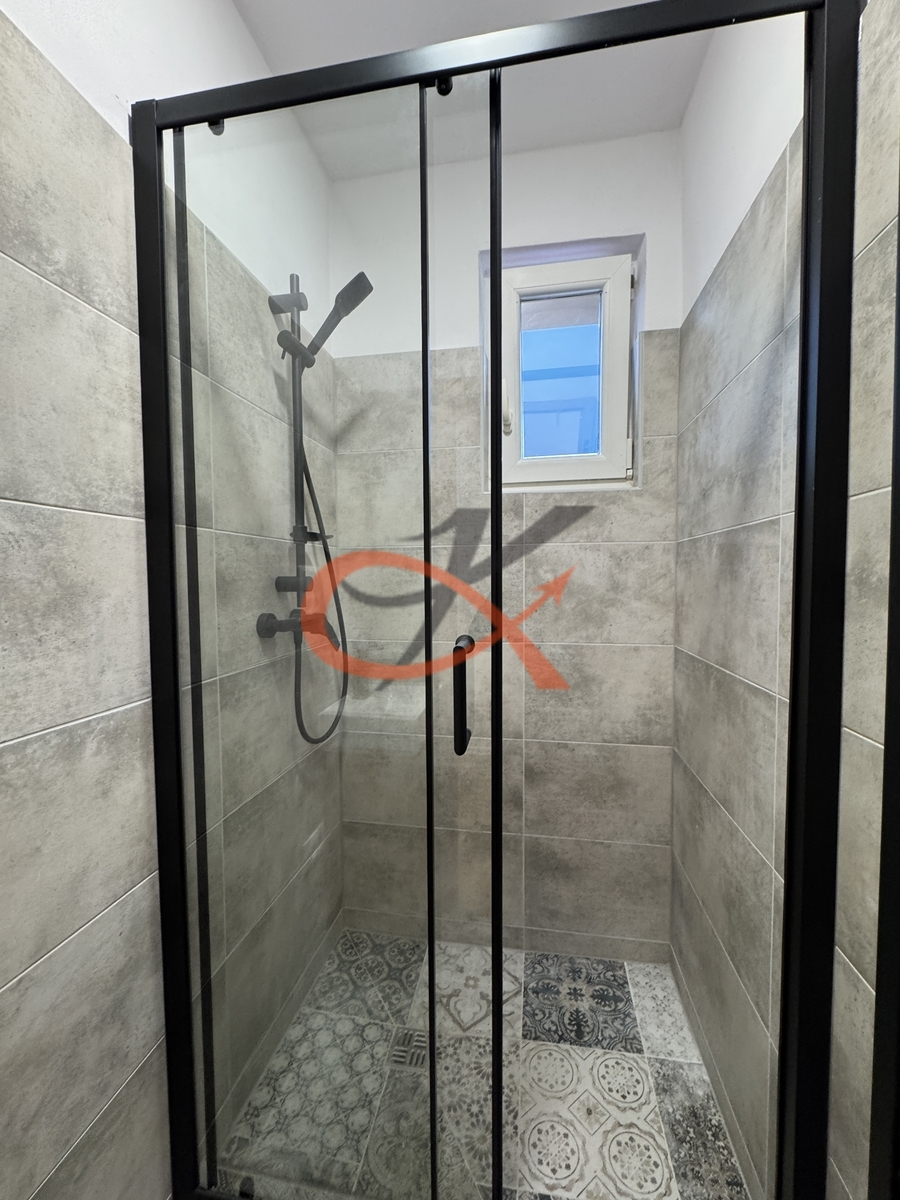 Dispozice bytu nabízí prostornou vstupní chodbu a velmi prakticky řešený kuchyňský kout s vestavěnou troubou, sklokeramickou varnou deskou, mikrovlnnou troubou a dostatkem úložných prostor. Samostatná koupelna se sprchovým koutem, toaleta. Hlavní obytný pokoj je světlý, s pěknými výhledy do okolí a je vybaven klimatizací. Byt se nachází na samotném vrcholu domu, což zajišťuje klid a dostatek soukromí.