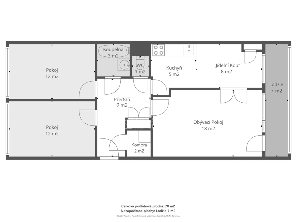 • Dispozice: 3+1 s lodžií a sklepem • Plocha: 70 m² + lodžie 7 m² + sklep 1,5 m² • Podlaží: 7/8 • Vlastnictví: osobní • Stav: původní, vhodný k rekonstrukci