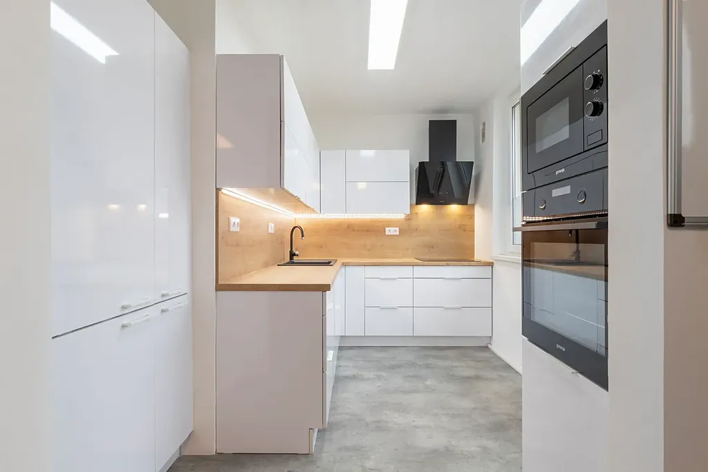 Byt prošel částečnou rekonstrukcí a je v současné době plně funkční k okamžitému užívání. Hotová je kuchyně, obývací pokoj a koupelna. Kuchyňská linka je vyrobena na míru od místního truhláře a je vybavena vestavěnou lednicí s mrazákem, indukční varnou deskou, horkovzdušnou troubou a digestoří.