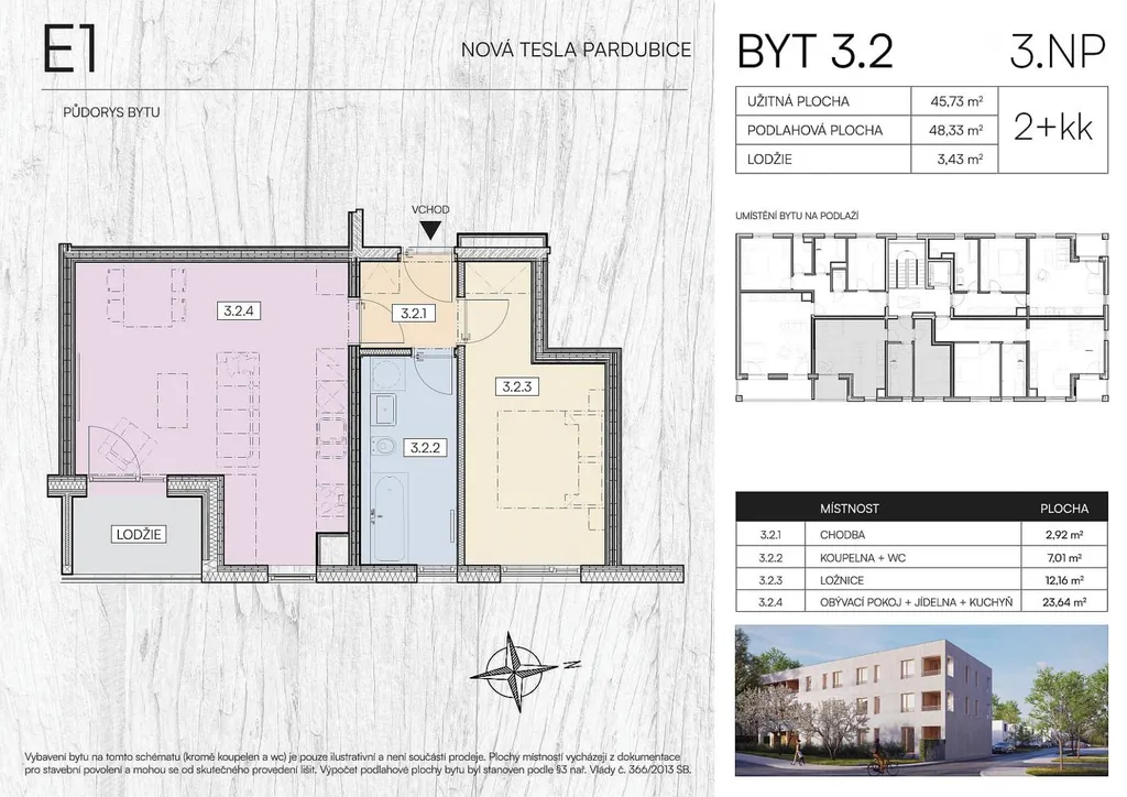 Jedná se o úplně nový nepoužitý byt 2+kk, 48 m2, 3.NP z projektu Nová Tesla Pardubice v unikátním bytovém domě ze dřeva (CLT panelů). Technologie: hybridní konstrukce (dřevěné CLT panely a betonové jádro). Menší třípodlažní dům s bezbariérovým přístupem a pouze 11 byty by mohl splnit Vaše očekávání klidného bydlení. Výhled na rodinné domy do ulice Zelená, nikoliv do oken dalších bytových domů. A to vše při dobrém spojení do centra, blízkosti železniční dopravy, nemocnice a přírody zároveň. Nedaleká cyklostezka, park a řeka Chrudimka umožňují sportovní vyžití o volných chvílích.