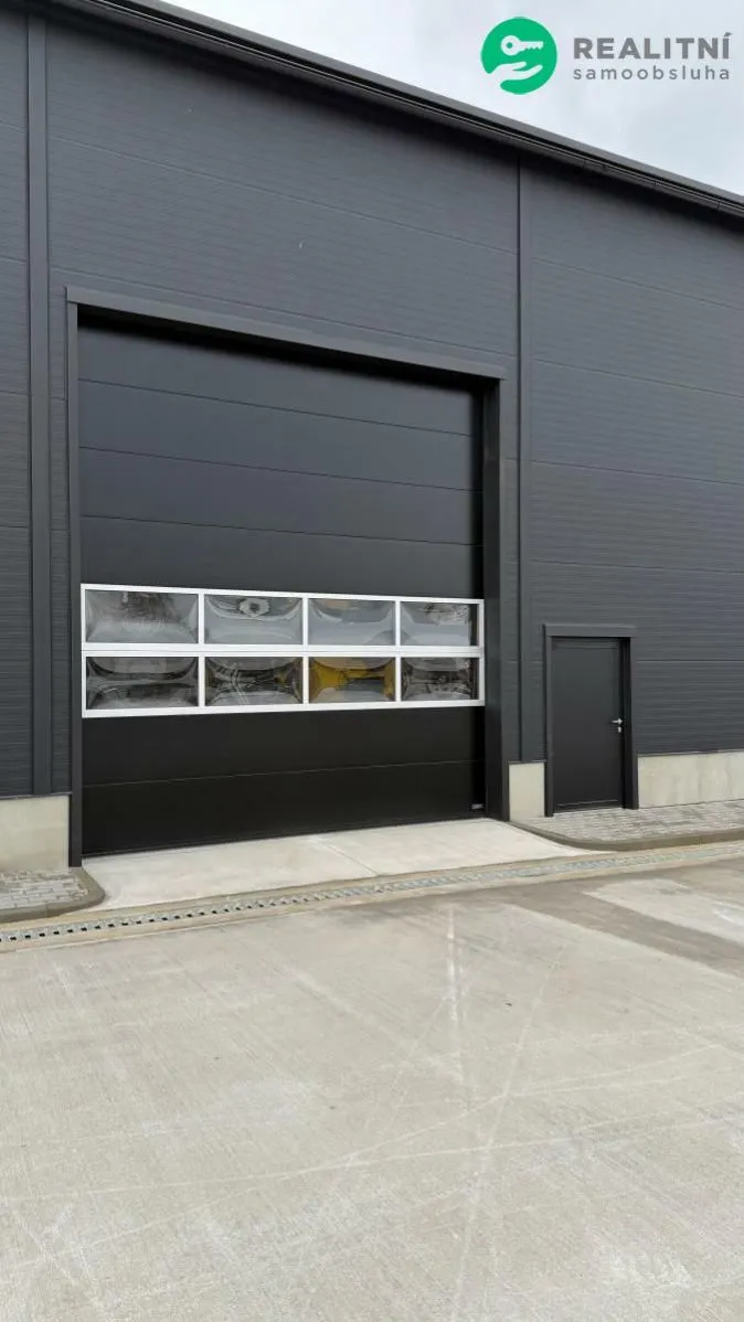 Vjezd do haly zajišťují sekční průmyslová vrata o velikosti 4,5 x 5m na výšku.