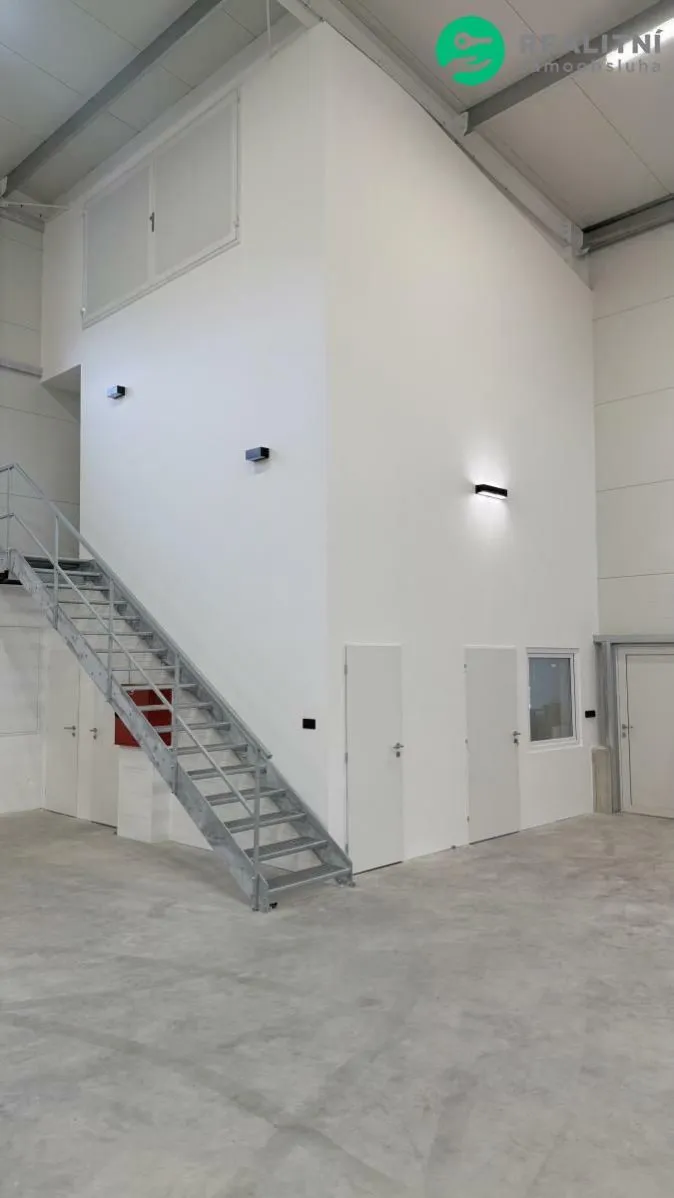 V přízemí haly je vytápěná / klimatizovaná kancelář, 2x WC a úklidová místnost.