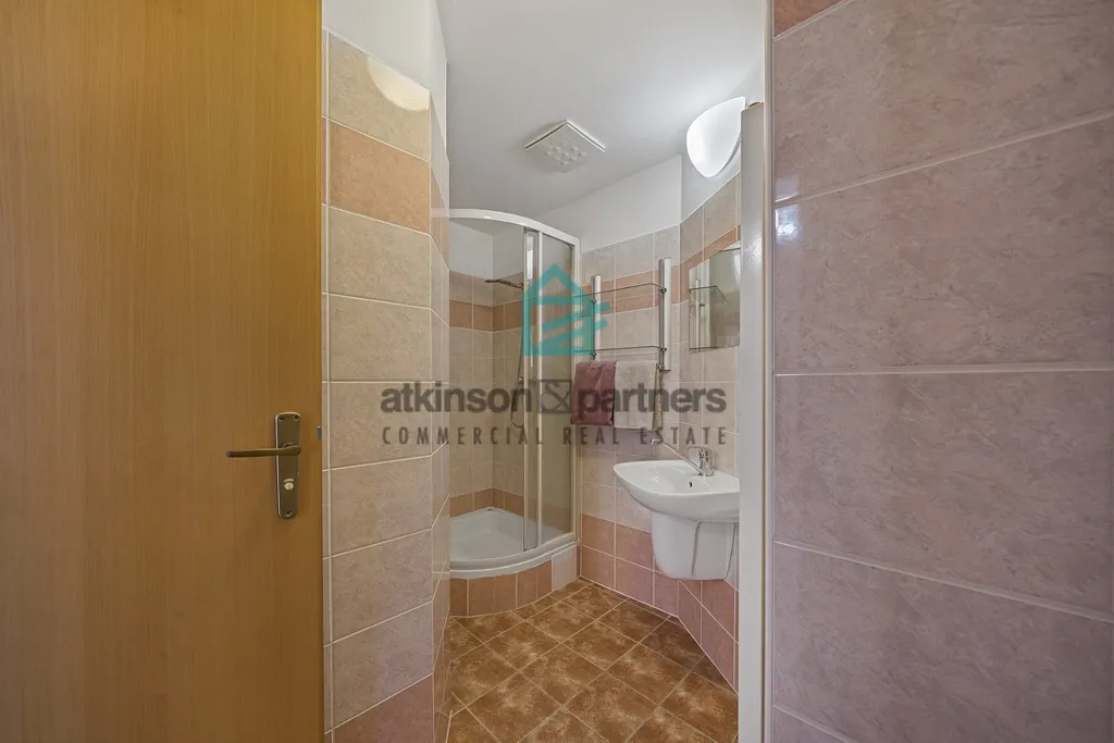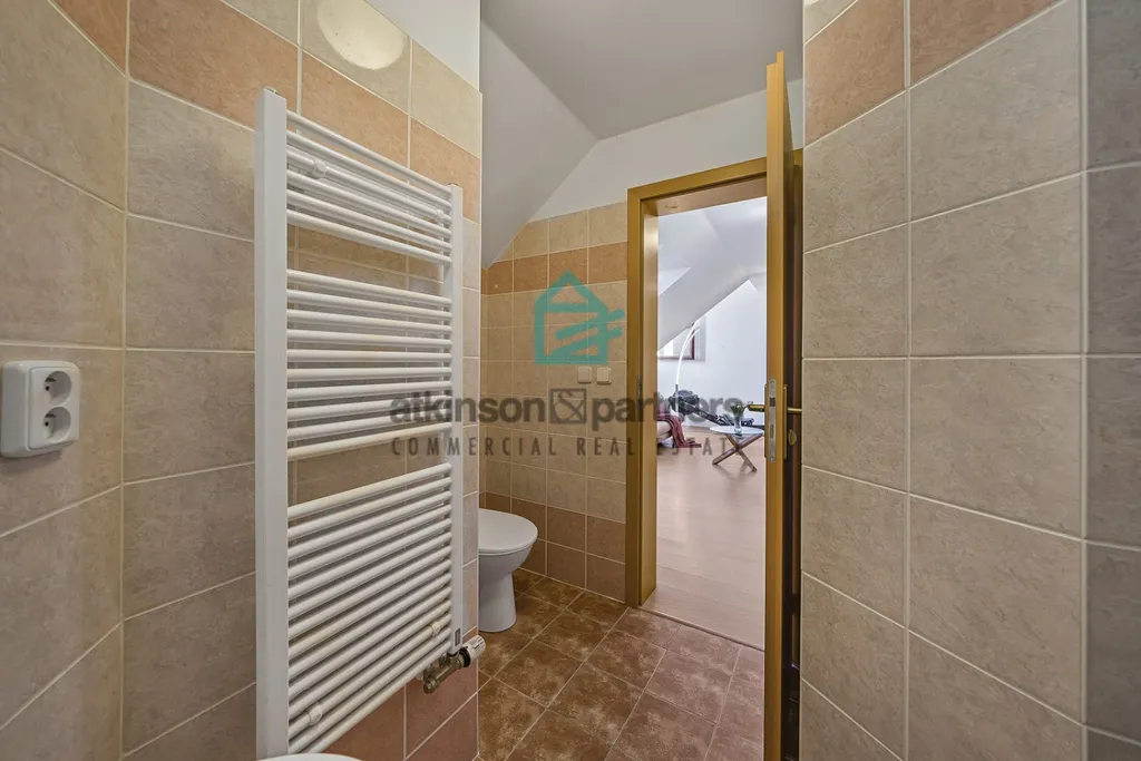 Byt disponuje dvěma koupelnami, jednou s vanou a druhou se sprchovým koutem a toaletou. Dominantou bytu je prostorný obývací pokoj s kuchyní, která je vybavena moderní kuchyňskou linkou se spotřebiči. Mezonetové řešení zajišťuje dostatek soukromí i prostoru pro rodinu, dispozičně stejně jako v rodinném domě.