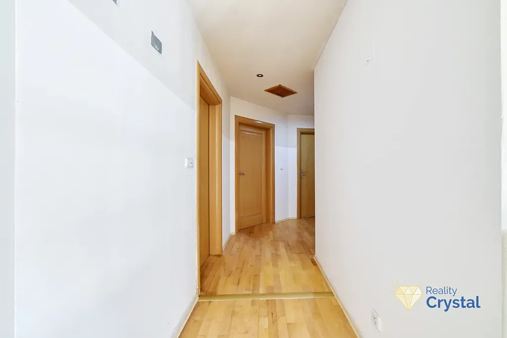 Dřevěným schodištěm se dostaneme do 1. patra a do dalších 4 pokojů a dvou koupelen. Podlahy v domě jsou plovoucí, dřevěné, v koupelná je dlažba.