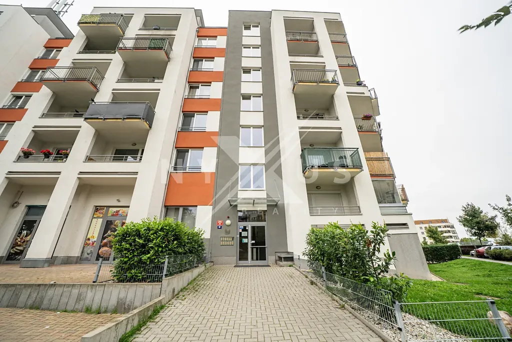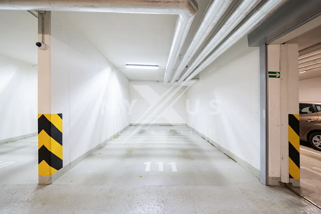 Byt se nachází ve 3. patře domu a jeho dispozice je navržena s ohledem na komfortní bydlení. Z chodby je vstup do komory, koupelny s vanou a toaletou, ložnice a do prostorného obývacího pokoje s kuchyňským koutem, odkud je vstup na slunnou lodžii. Velkou výhodou je sklep umístěný hned na patře vedle bytu, což zajišťuje pohodlný přístup k úložnému prostoru. Součástí bytu je také garážové stání, které je z obou stran chráněno zdí, a poskytuje tak soukromí a bezpečí.