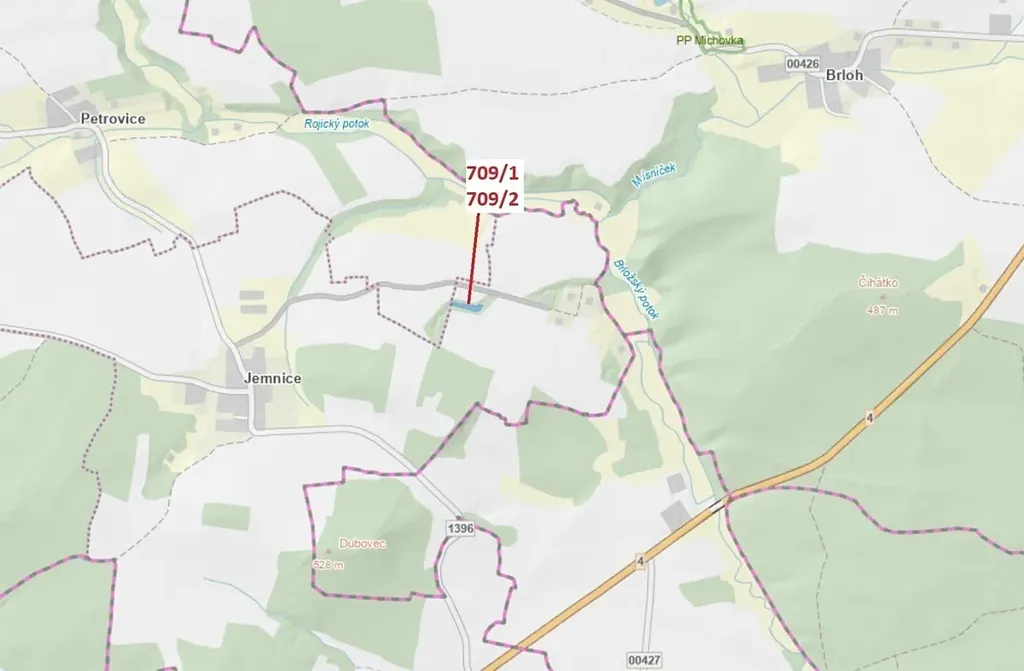 Lesní pozemky o výměře 1823 m2, parcelní čísla 709/1, 709/2, podíl 1/1, katastrální území Jemnice u Oseka, obec Osek, obec s rozšířenou působností Strakonice, okres Strakonice, Jihočeský kraj. Po těžbě.