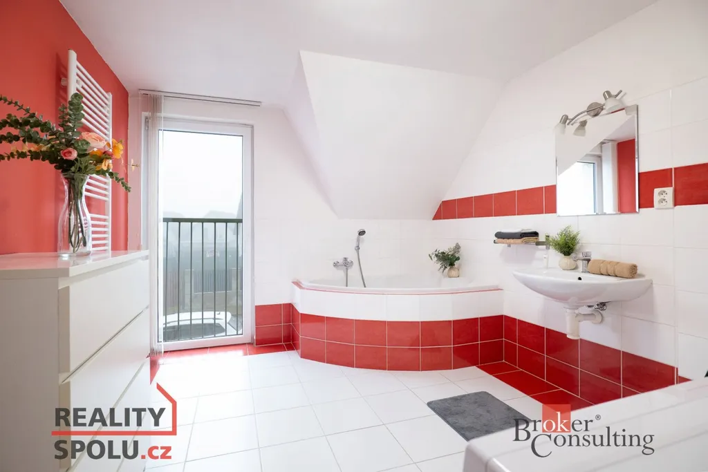 V patře najdete dva dětské pokoje, ložnici a prostornou koupelnu. Ze dvou pokojů je vstup na balkon. Další úložný prostor je pod hřebenem střechy.