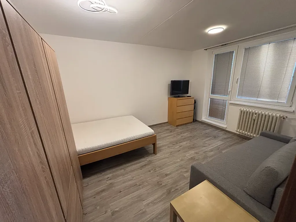 Byt je kompletně zařízen, pračka zn. Beko, lednice, mikrovlnná trouba, obývací stěna, postel, Tv, sedací souprava, stolek, jídelní stůl a židle, komoda a led osvětlení v celém bytě.