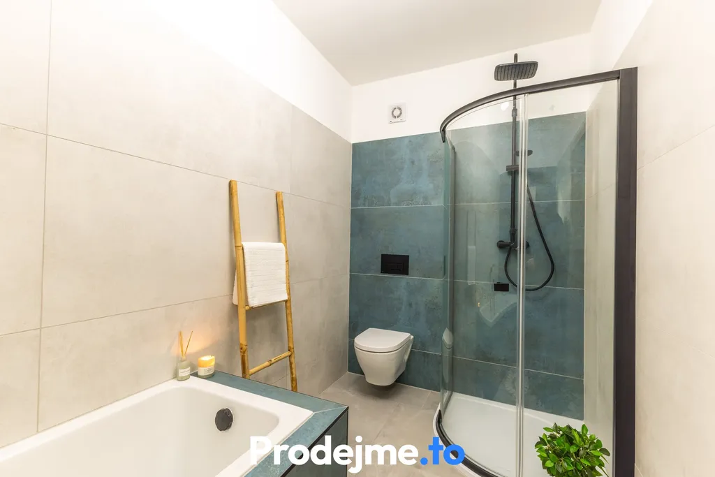 Elegantní koupelna s velkoformátovými obklady disponuje vanou i sprchovým koutem. Samozřejmostí je toaleta přímo v koupelně.
