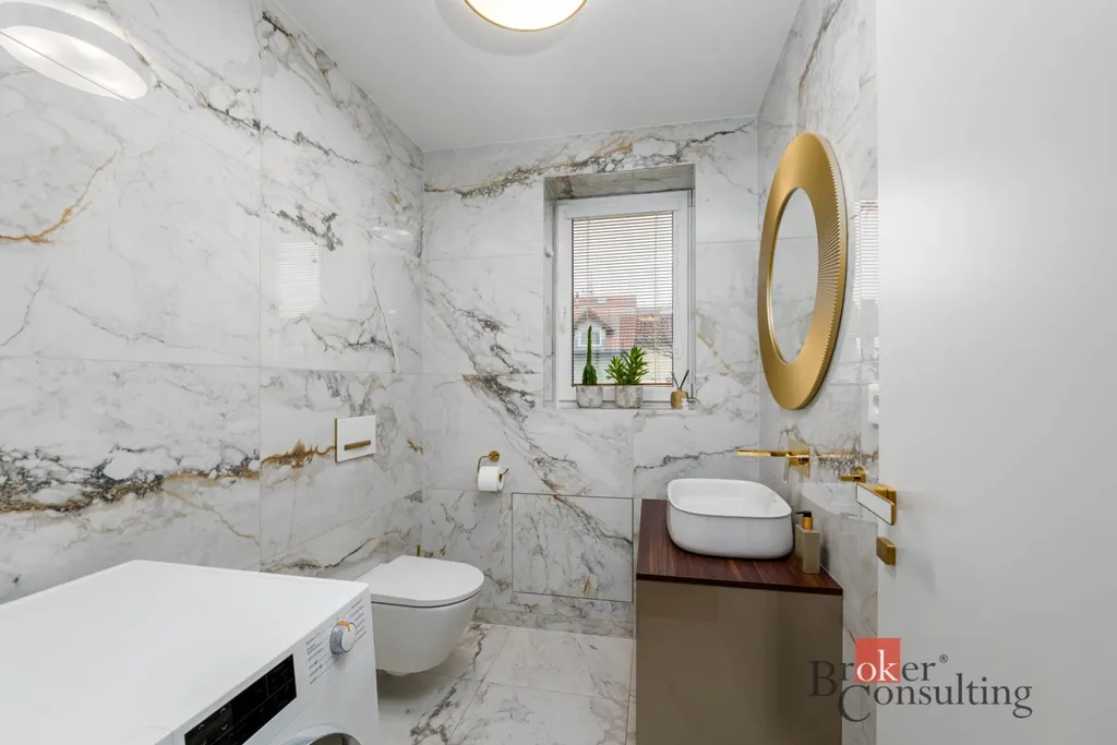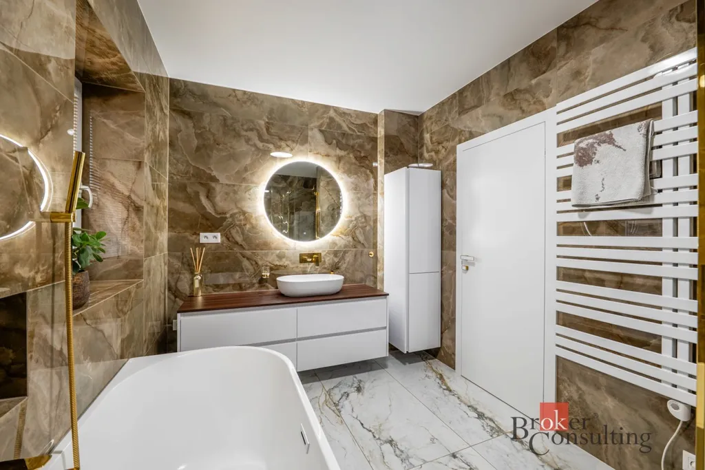 • luxusní koupelna s prostornou vanou i sprchovým koutem, obklady od italských výrobců, baterie Sapho ve zlatém designu (součástí koupelny je i toaleta)