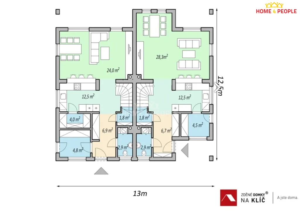 Každá část dvojdomu je plně samostatná s důrazem na zachování soukromí jak u vchodové části, tak u části terasové.