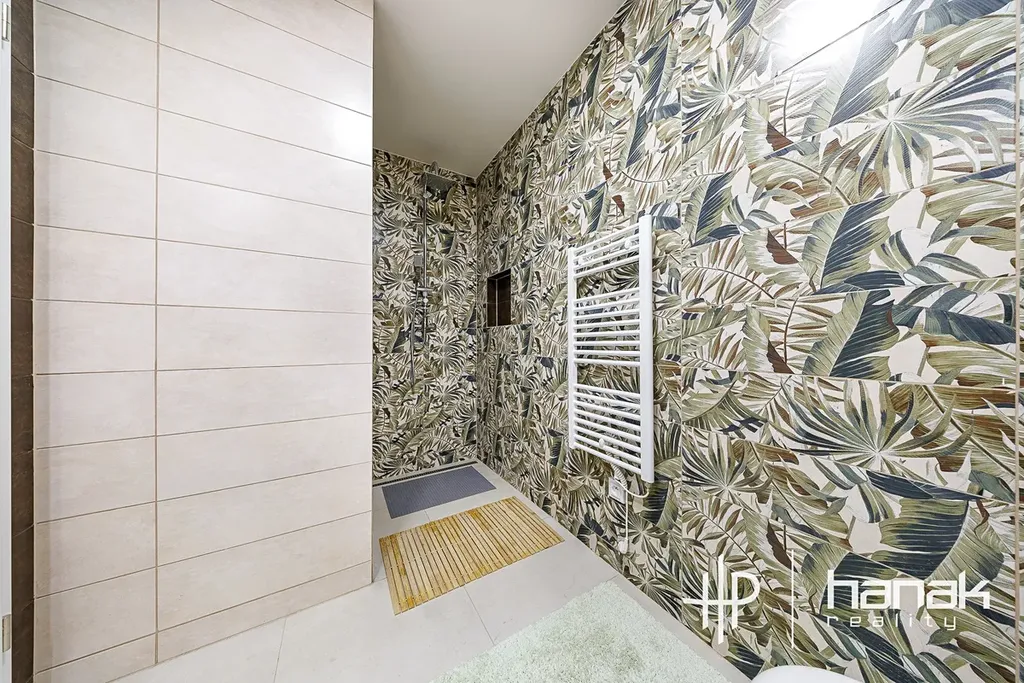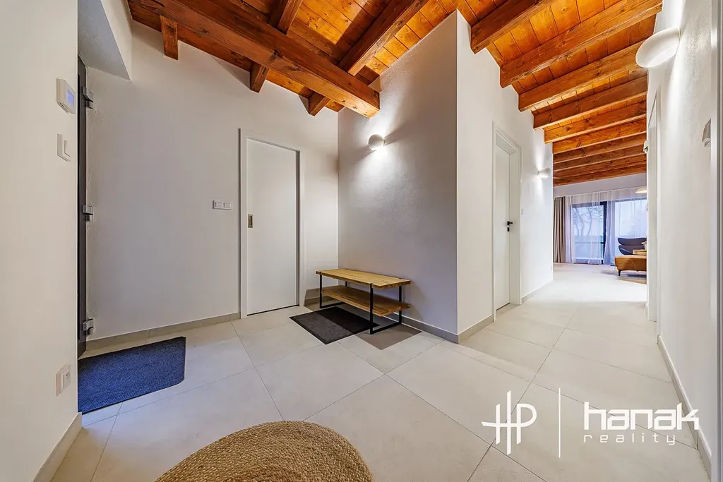 Součástí přízemí je také ložnice s trámovým stropem a velkým sedacím oknem, které dodává interiéru světlo a nadčasovou atmosféru. Dále zde najdete šatnu u vstupu, moderní koupelnu, technickou místnost s místem pro pračku a sušičku a praktickou spíž.